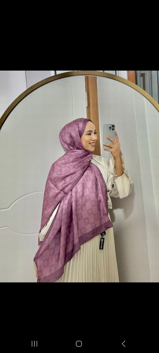 Kadınlar için ipeksi, dökümlü ve açık mor renkte, desenli şal. Mütevazı bohem tarzına uygun. ✨