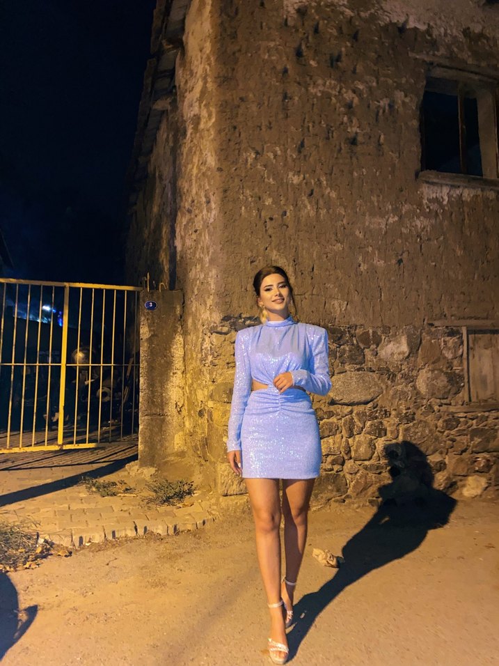 Işıltılı payet desenli, yüksek yakalı ve uzun kollu mini elbise, cesur parti stili için ideal. ✨