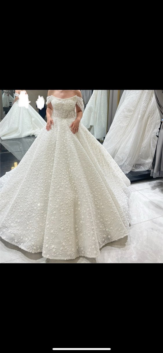 Beyaz prenses gelinlik, kısa kollu ve omuzları açık, vücuda oturan üst kısmı ile uzun, çiçek detaylı eteklere sahiptir. Klasik şıklık ve modern ışıltıyı bir araya getirir.