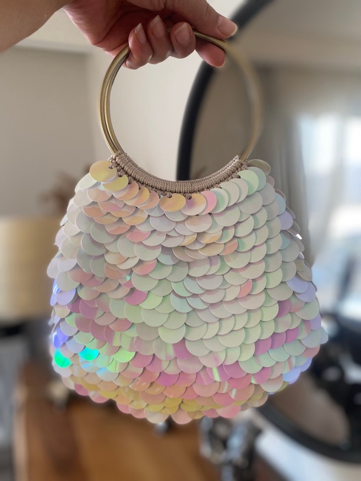 Işıltılı pullarla kaplı, çok renkli tie-dye desenli bohem stil kadın çantası, parlak metal saplı, parti için uygun. ✨
