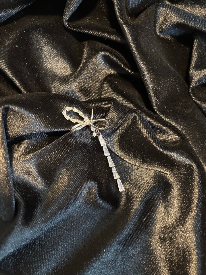 İşlemeli fiyonk detaylı, sarkıtlı ışıltılı siyah broş, düğünlerde şık bir dokunuş sağlar.