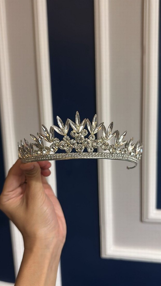 Beyaz ve ışıltılı taşlarla süslü gelin tacı, klasik zarafeti yansıtan gösterişli bir tasarıma sahiptir. ✨