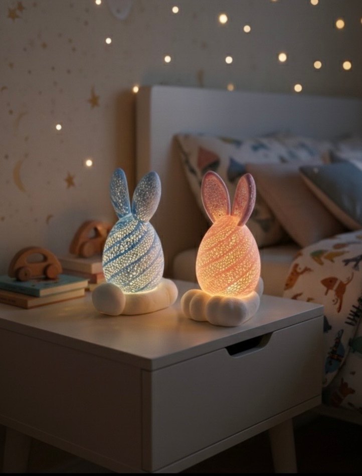 Çocuk odalarına ve dekorasyonunuza sihirli bir dokunuş! Özel dokulu tasarımıyla hem şık bir obje hem de huzur veren bir gece lambası. • LED Mum Dahil: İçindeki LED mum sayesinde ısınma yapmaz, çocuk odaları için tamamen güvenlidir. • Zarif Tasarım: Mavi-beyaz ve renk seçenekleri, bulut görünümlü beyaz taban. • Kullanım: Komodin, raf veya çalışma masası için ideal boyut. • Hediye Seçeneği: Yeni doğan ve doğum günü hediyesi için eşsiz bir tercih. Paket İçeriği: 1 Adet Tavşan Figürü + 1 Adet LED Mum.