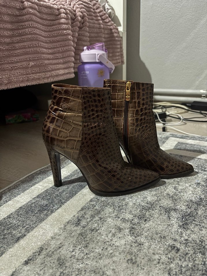 Gardırobunuzun yıldızı olacak, hem çok havalı hem de çok şık bir parça! Timsah derisi görünümü (croco) ve hafif metalik kahve tonuyla her türlü kombinine (jean, etek veya elbiselerle) lüks bir dokunuş katar. • Durumu: Genel kondisyonu çok iyi, fotoğraflarda görüldüğü gibi diri duruyor. • Detay: Topuk kısmında ve uç kısmında kullanıma bağlı, fotoğraflarda şeffafça belirttiğim ufak sürtünme izleri mevcuttur. Giydildiğinde kesinlikle göze batmıyor; boya veya kalemle kolayca rötüşlanabilir. #bot #topuklubot #croco #timsahdesen #kahverengibot #abiye #şık #moda #zara #mango #stradivarius #stiletto #vintage #deribot #uygunfiyat