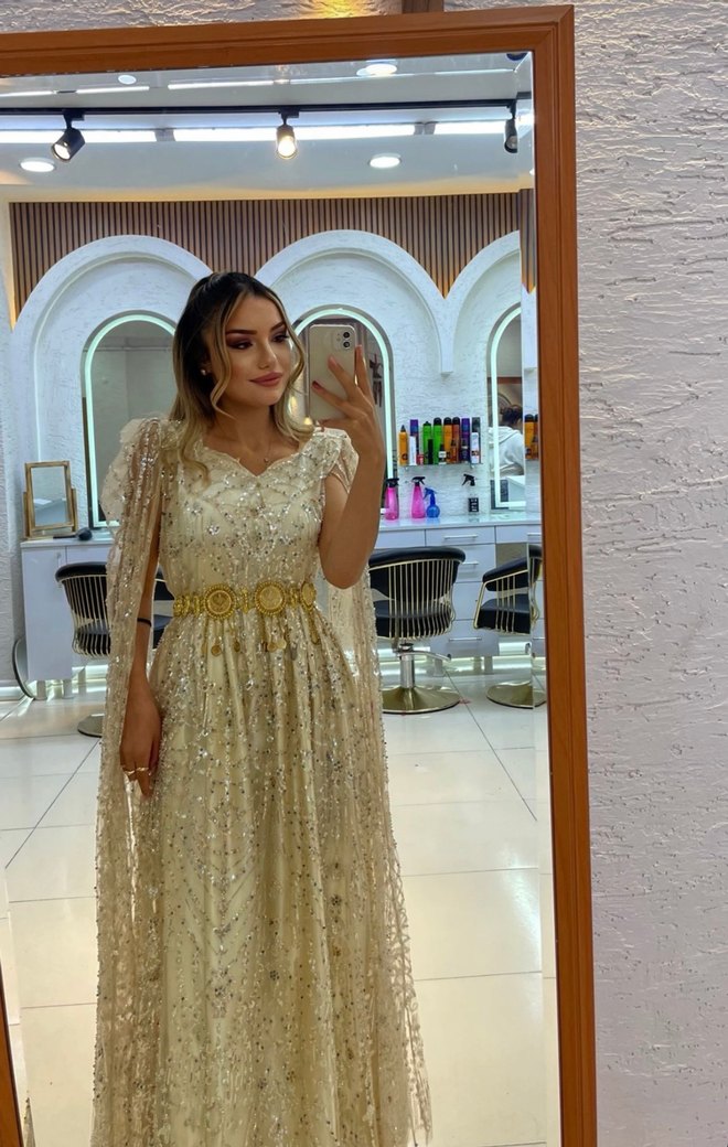 Işıltılı detaylara sahip, straplez yaka ve etnik desenli uzun, bol kesim altın rengi nişan elbisesi. Klasik ve göz alıcı düğünler için ideal. ✨