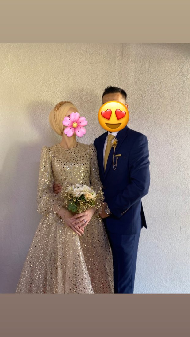 Bu fitted altın renkli nişan elbisesi, uzun boyda ve ışıltılıdır . Uzun kollu gösterişli düğünler için uygundur. ✨