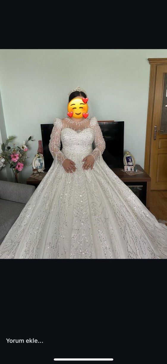 Bu oturan kesim prenses gelinlik, tekne yaka ve uzun kollara sahiptir. Beyaz kumaşı ışıltılı detaylarla klasik ve göz alıcı bir görünüm sunar. ✨