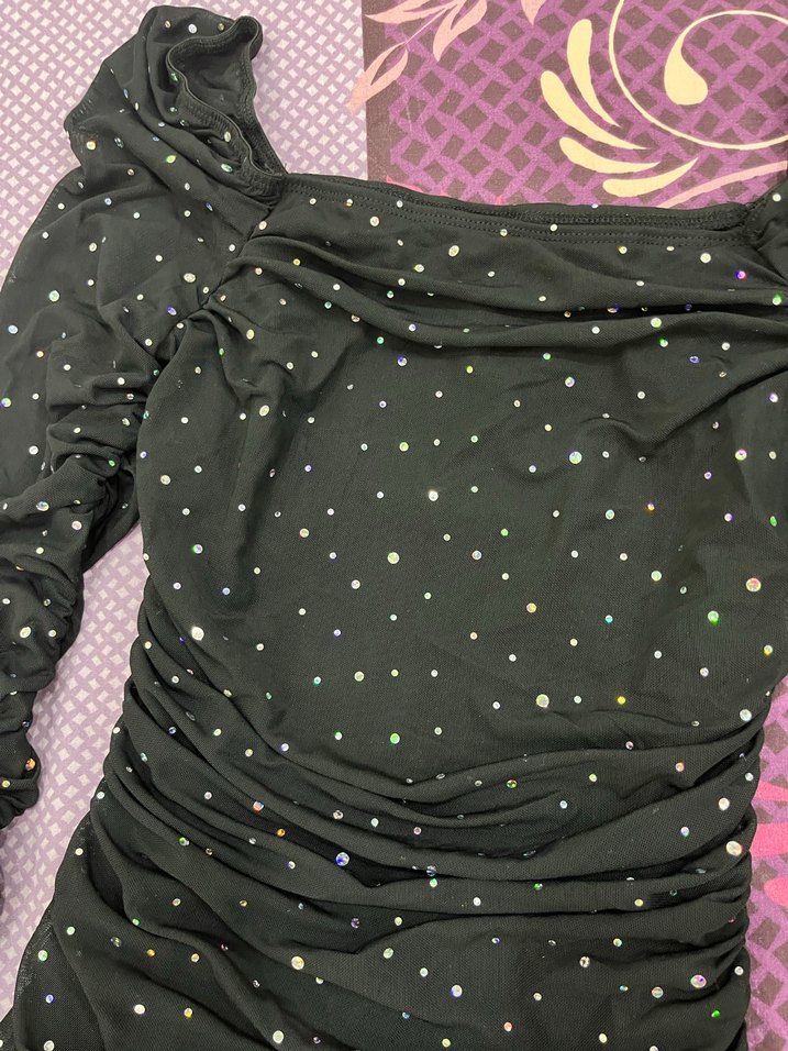 Dar kesim, tekne yaka ve uzun kollu bu abiye elbise, çok renkli payetlerle süslenmiş koyu renkte kumaştan yapılmıştır. Desenli ve göz alıcı gotik stile sahip, parti için uygun. ✨