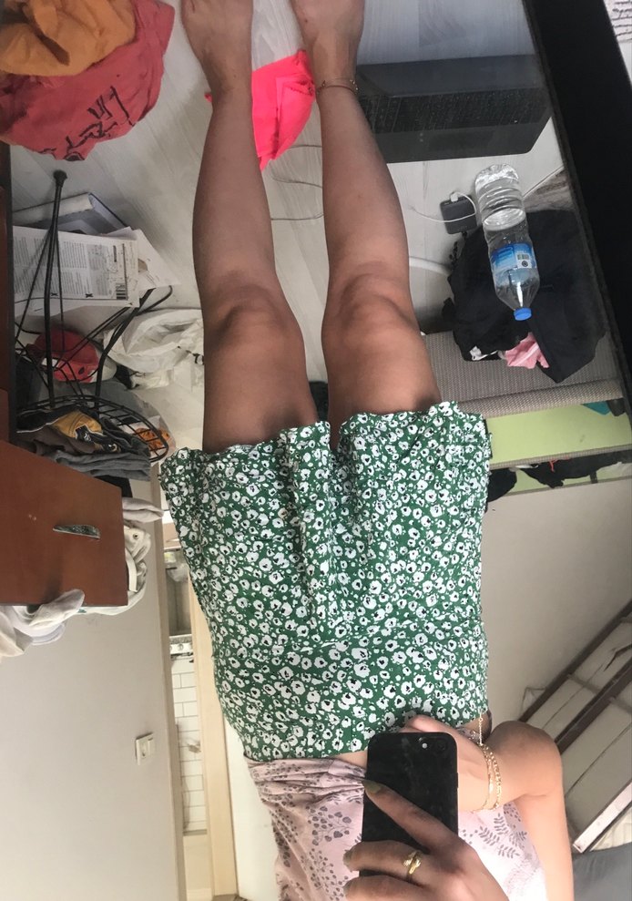 Işıltılı yeşil renkte, tokalı ve vücuda oturan hamile şortu. Düz desenli, sentetik kumaştan yapılmıştır, günlük ve spor tarzlar için uygundur.