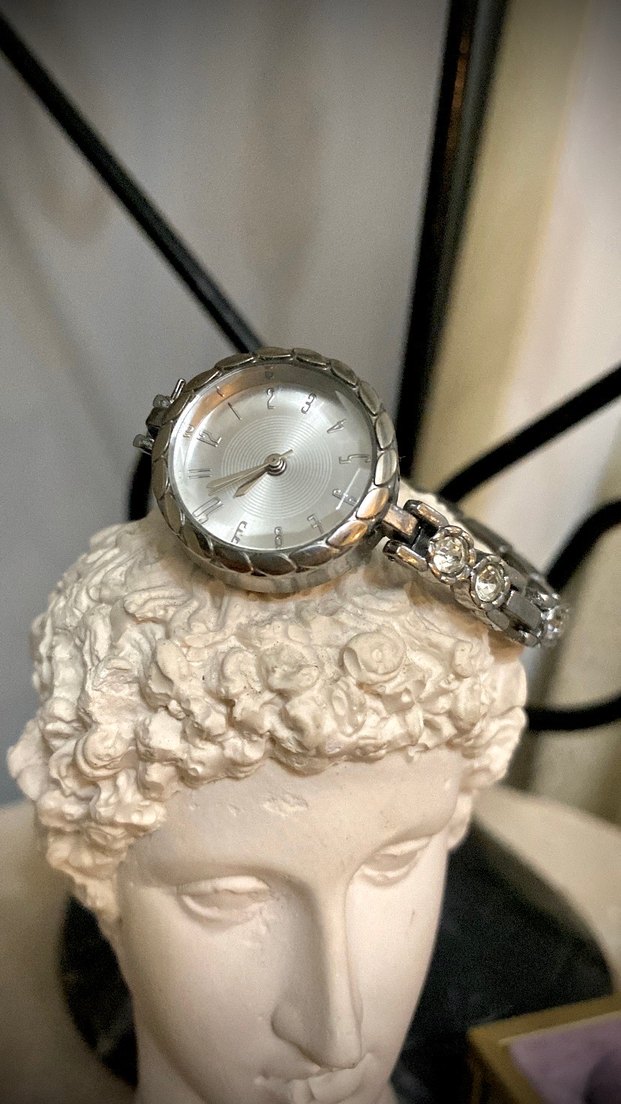 Saatin en dikkat çekici özelliği, kayışın kasa ile birleştiği noktada yer alan sıralı berrak zirkon (veya yapay pırlanta) taşlardır. Bu detay, saati sadece zaman gösteren bir araç olmaktan çıkarıp, zarif ve ışıltılı bir bileklik görünümüne kavuşturur. Taşlar, bilekte hareket ederken ince bir parlaklık yayarak sade tasarımı zenginleştirir.