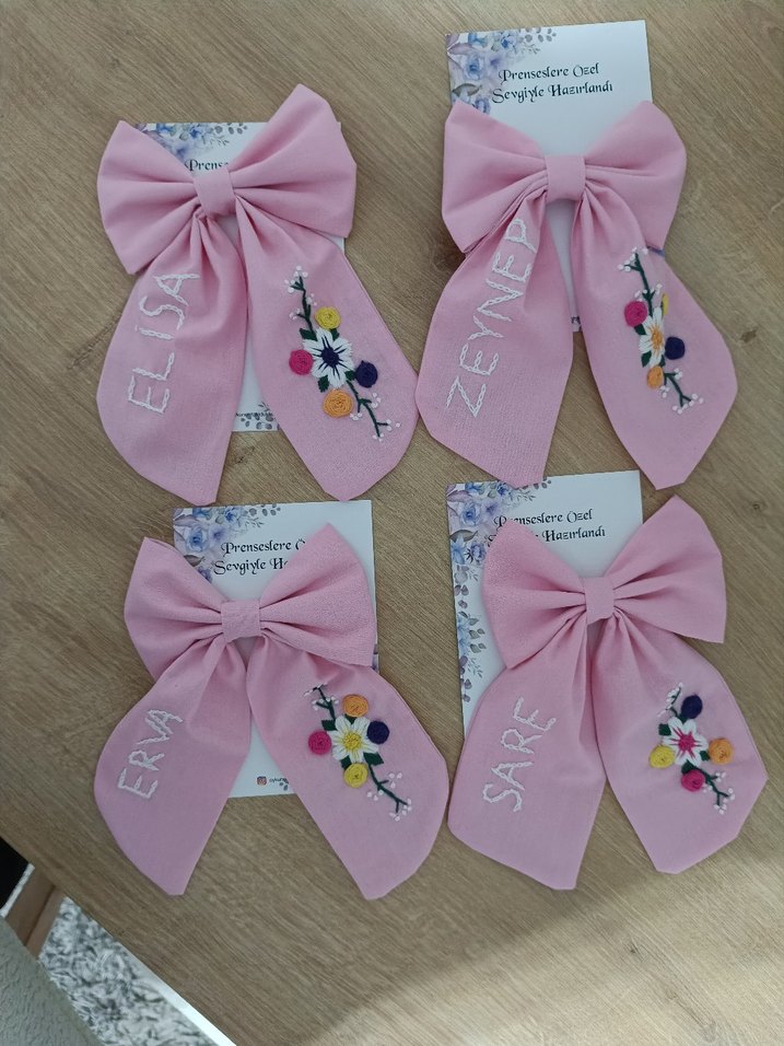 İsim işlemeli, nakışlı çiçek detaylı pastel pembe fiyonk saç tokaları. Bohem tarzda çocuk aksesuarı.