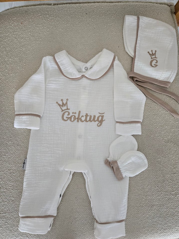 müslin kumaştan hazırlanmıştır. kişiye özel isim nakışlı hazırlanmaktadır