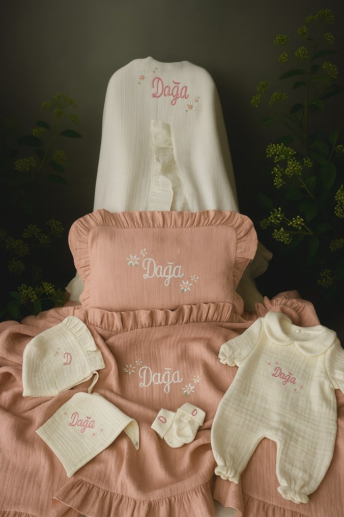 Nakış işlemeli ve fırfırlı set. Tulum, battaniye, yastık,şapka , çorap ve puset örtüsü , önlük. isme özel nakışlanmaktadır