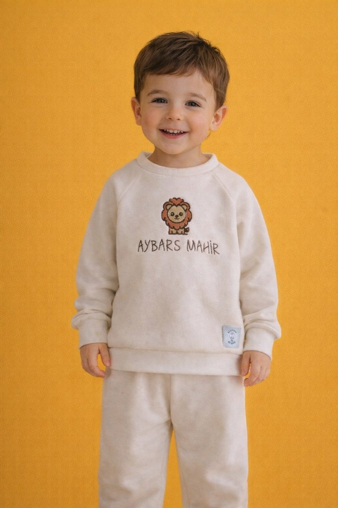 Yumuşak kumaştan, rahat kesim krem renkli puff kollu sweatshirt. Önünde aslan nakışı ve isim nakışı bulunur. Streetwear tarzına uygun. isterseniz takim olarak da sipariş verebilirsiniz. 0-5 yas grubu icin fiyat gecerlidir