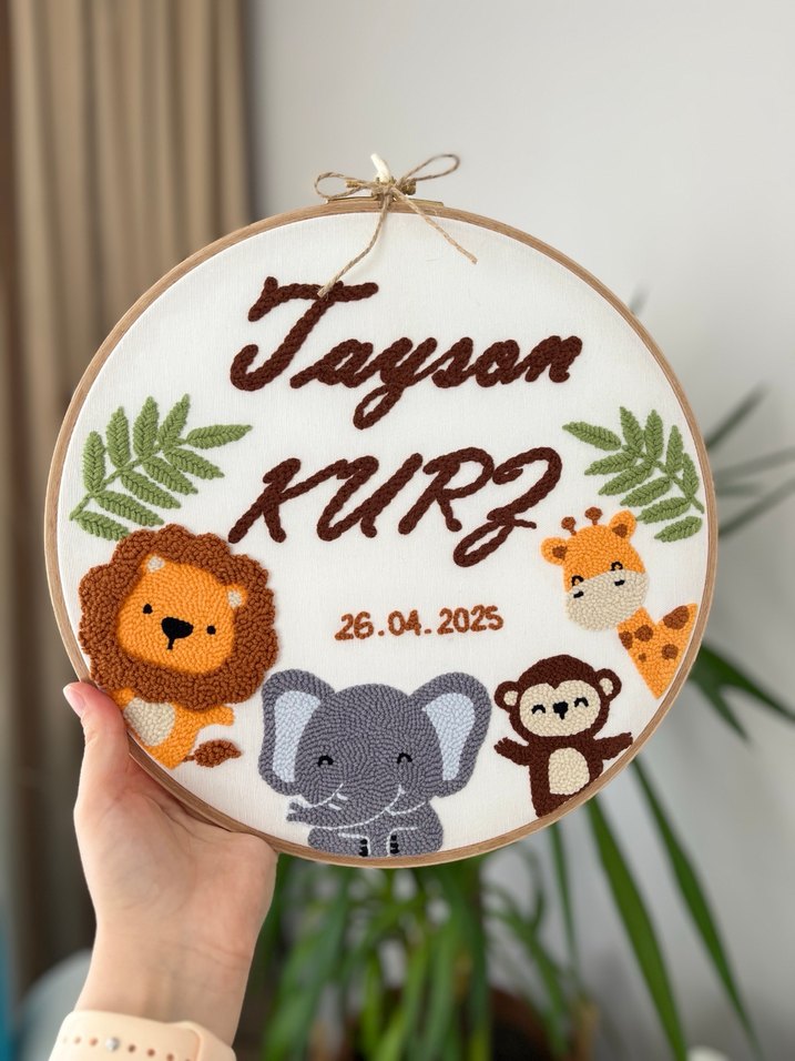 Nakışlı hayvan figürleri ve kişiselleştirilmiş isimli kasnak pano. Yumuşak kumaş, aslan, fil, zürafa ve maymun figürlü. 30cm lik kasnak üzerine işlenmiştir. Siparişe göre hazırlanır
