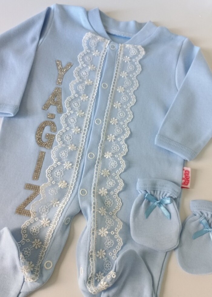 Yagiz isimli bebek icin. Pamuklu urun. Tulum ve eldiven.