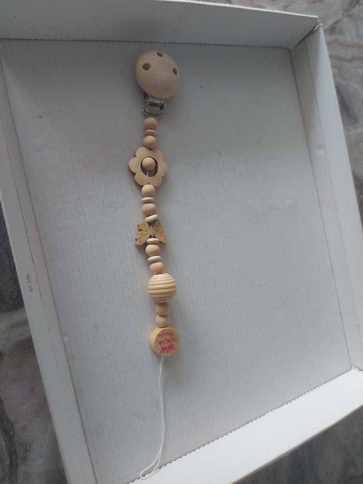 Bej renkli ahşap boncuklar ve klipsli emzik zinciri, hafif ve doğal tasarıma sahiptir.istenilen isim yazilir adet fiyati 200 almak istediginiz rengi ve ismi belirtiniz