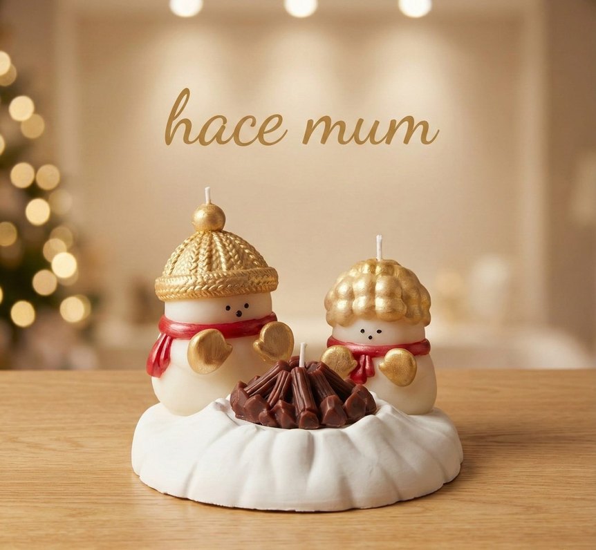 Altın renginde iki karakter mum, beyaz taban üzerinde kamp ateşi etrafında oturuyor. 'hacemum' yazısı bulunur. ️