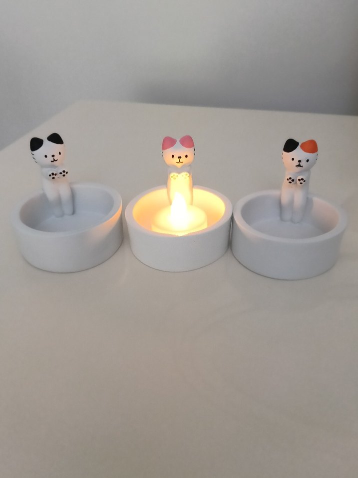 Isınan kedi figürlü beyaz mumluk, küçük mumlar için uygun ve ortamınıza eğlenceli bir dokunuş katıyor. ️