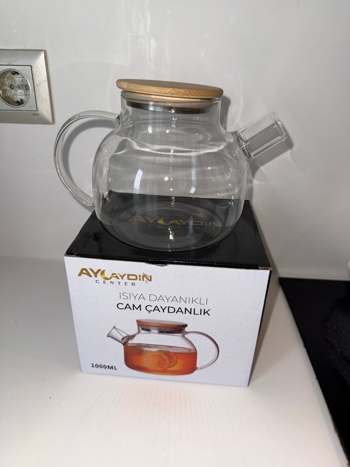 Isıya dayanıklı camdan üretilmiş 1000ml kapasiteli çaydanlık, bej renkli ahşap kapaklıdır. Sıcak içecekler için uygundur.