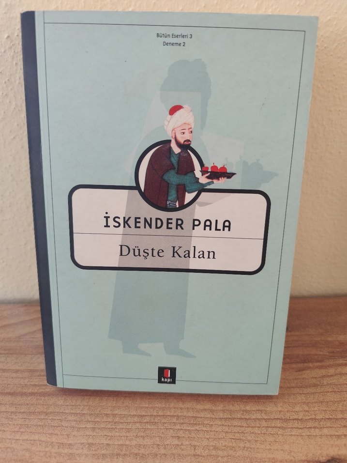 İskender Pala'nın "Düşte Kalan" adlı deneme kitabı, açık mavi kapak ve nar tepsisi tutan adam illüstrasyonuna sahip.