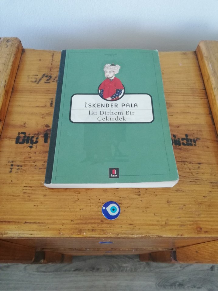 İskender Pala'nın "İki Dirhem Bir Çekirdek" adlı mizah kitabı, yeşil kapak ve karikatürlü kapak tasarımı ile.