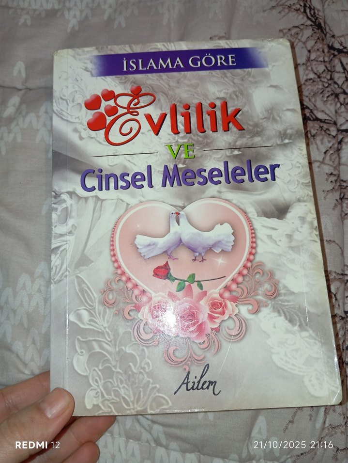 İslama göre evlilik ve cinsel meseleler hakkında bilgiler içeren, güvercin ve güllerle süslenmiş kapaklı kitap.