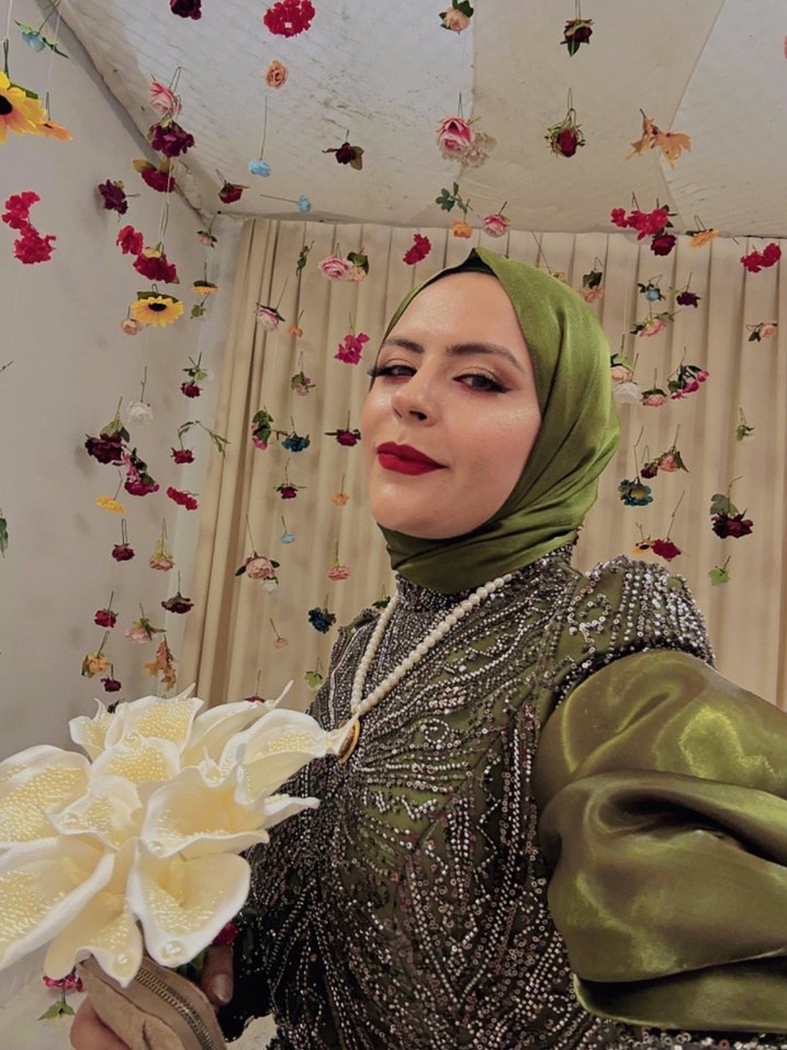 İşleme detaylı Haki Uzun Kollu Tesettür Abiye, yüksek yakalı ve uzun kollu, drapeli haki renkli, vücuda oturan henna elbise. Şık taş işlemeli, düğün, davet, kına için uygun