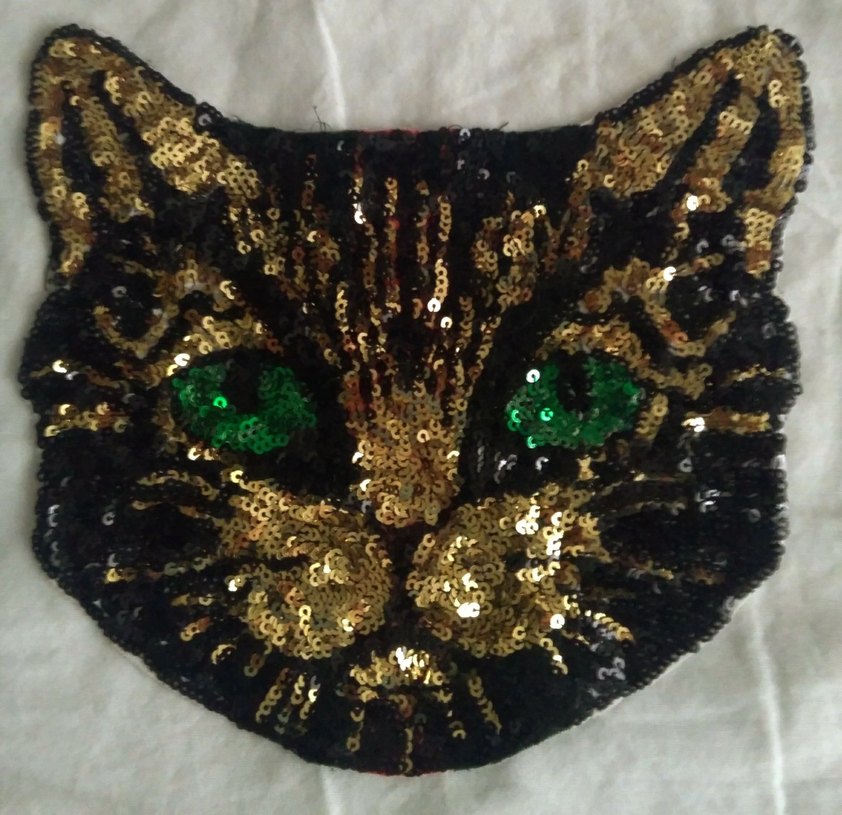 Her karesi minik pullarla işlenmiş büyük kedi sticker.Eni 18cm boy 17 çanta ve kıyafetlere dikilebilir.Siyah görünen yerlerde de siyah aralıksız minik pullar var.Maharetli ellerde değerlendirilsin.İnanilmaz güzel Gucci den.