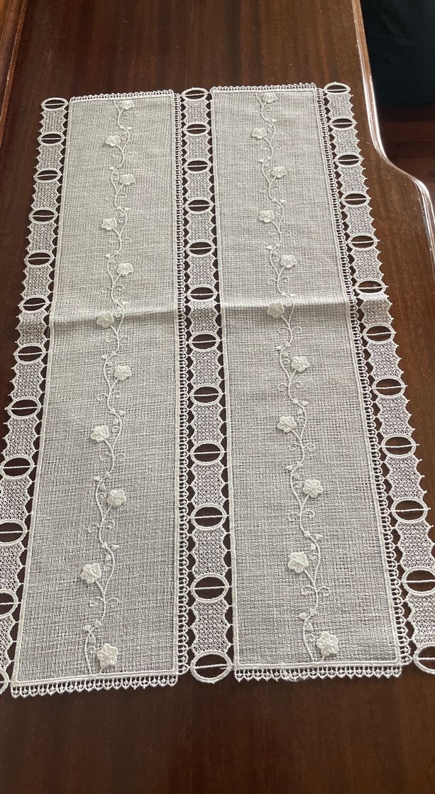 60x34 İşlemeli çiçek desenleri ve gri dantel kenarıyla klasik kırık beyaz Fransız güpür sehpa örtüsü, masanıza zarif bir dokunuş katar. ️