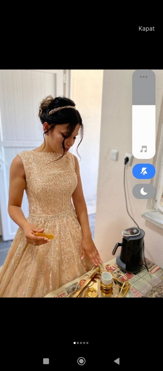 V yakalı, işlemeli ve boncuk detaylı bej renkli, kollu olmayan, a Kesim abiye elbise.