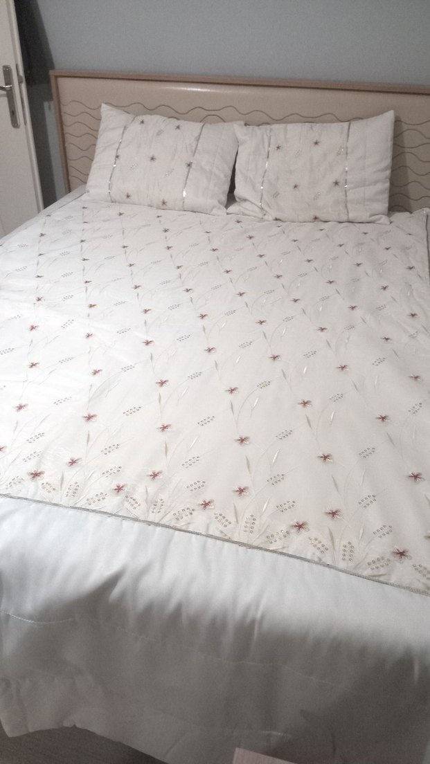 İnce işlemeli çiçek desenlerine sahip krem yatak örtüsü ve uyumlu yastık kılıfları. Yumuşak ve hafif kumaş rahatlık sağlar. ️Sadece görseldeki yerinde aşınma vardır