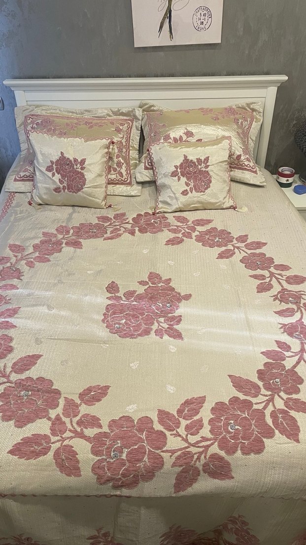 Home Art Collection Yatak Örtüsü made by koçaklar. çift kişilik yatak örtüsü. ebatları 265 x 260. çok az kullanıldı. tertemiz. Yumuşak krem zemin üzerine açık pembe işlemeli çiçek desenleri bulunan yatak örtüsü, yatak odanıza zarif bir dokunuş katar.