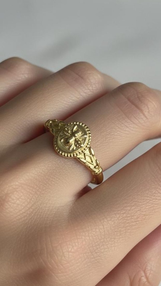 Parlak altın renginde, boncuklu ve işlemeli detaylara sahip bohem tarzda yüzük. Paris şıklığını yansıtan romantik akşamlar için ideal.