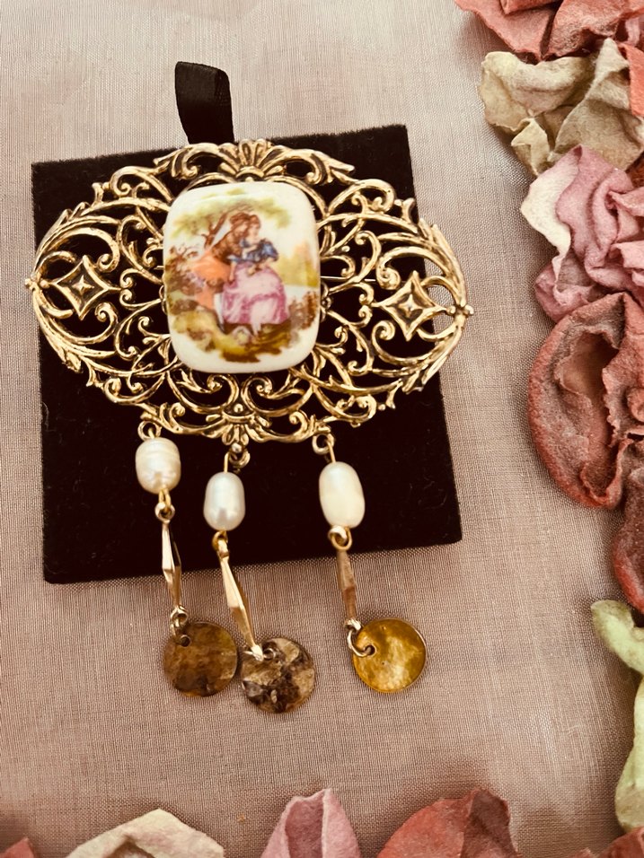 İşlemeli Altın Renk Vintage Broş