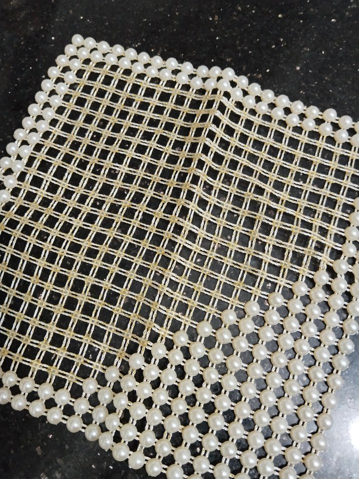 İşlemeli desenli, inci görünümlü boncuklarla çevrili parlak altın renkli banyo paspası.