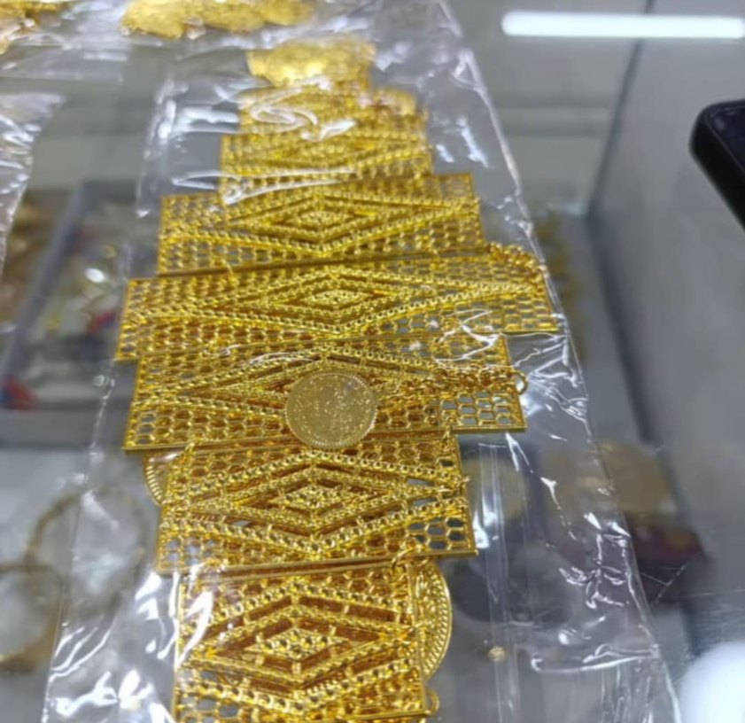 Parlak altın renkli kadın el zinciri, detaylı işlemeli desenlere sahiptir. Düğün gibi gösterişli anlar için mütevazı ve geleneksel bir stildir.✨