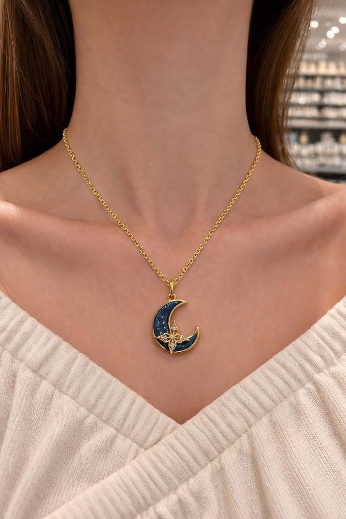 Parlak altın zincir üzerinde midi uzunlukta, işlemeli ay figürlü kolye, bohem tarz ve klasik zarafeti birleştiriyor.