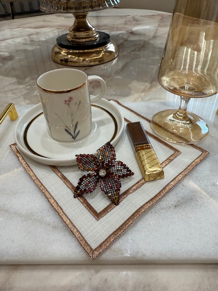 Hafif altın renkli, işlemeli desenlere sahip modern klasik tabak takımı. Altın detaylı peçete ve fincanla şık sunumlar için uygun. ☕