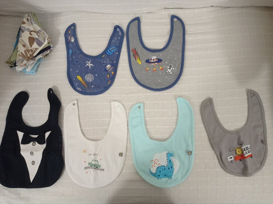 İşlemeli desenlere sahip bebek önlükleri, gri, mavi, beyaz ve açık mavi renklerde, çıtçıtlı kapanışlıdır.