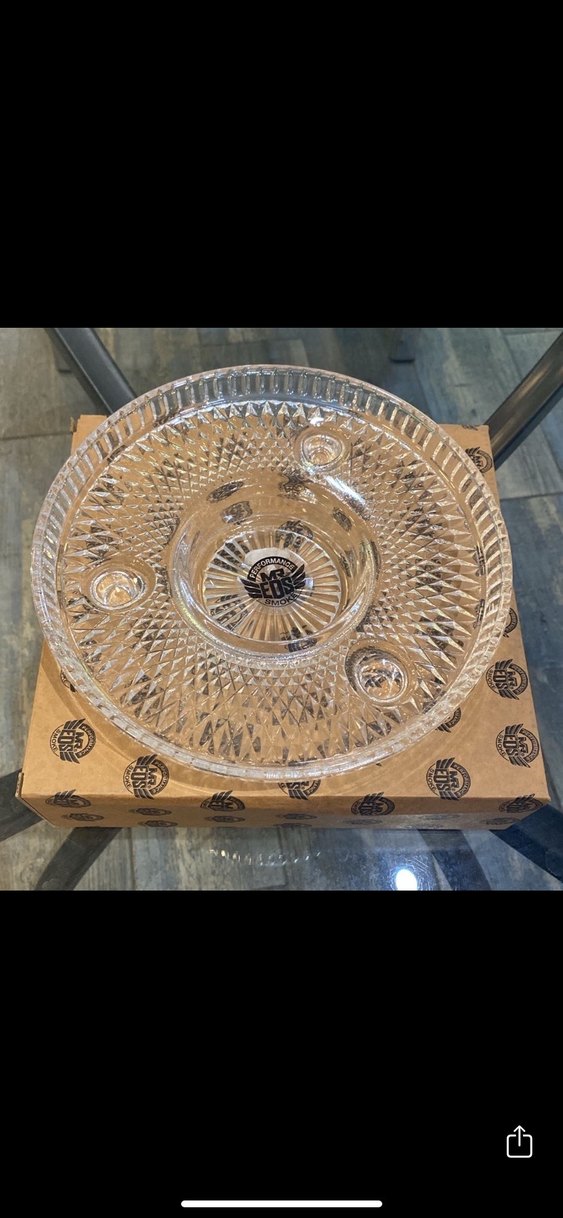 İşlemeli desenli, bej renkte, geleneksel tarzda cam tabak. ️