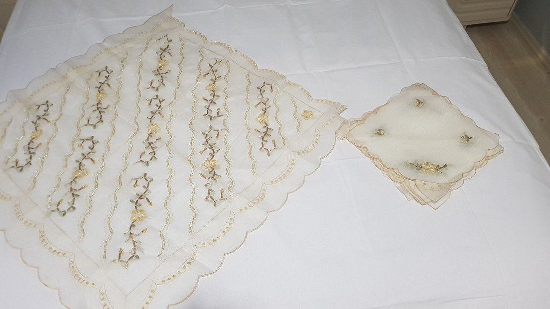 ✔️ Hiç kullanılmamıştır, sıfır üründür ✔️ El emeği ince nakış / dantel işlemeli ✔️ Şık ve zarif salon takımı ✔️ Çeyizlik ve misafirlik kullanıma uygundur ✔️ Lekesiz, yırtıksız, tertemiz Set içeriği: • 1 adet büyük masa örtüsü • 1 adet runner • 2 adet sehpa örtüsü • 12 adet peçete