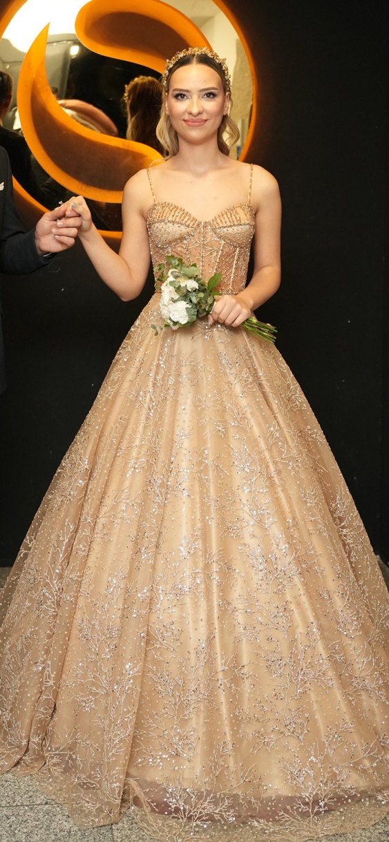 İşlemeli ve boncuk detaylı, straplez yakalı, bej renkli, parlak kumaştan yapılmış, uzun ve vücuda oturan abiye elbisedir. Modern klasik ve gösterişli bir tasarıma sahiptir. Tarlatanlı ya da tarlatansız kullanılabilir ben tarlatanlı kullandım nişanımda giydim az s m l bedene kadar rahatlıkla olur arkası ipli olduğundan dolayı hiçbir yerinde bir problemi yoktur