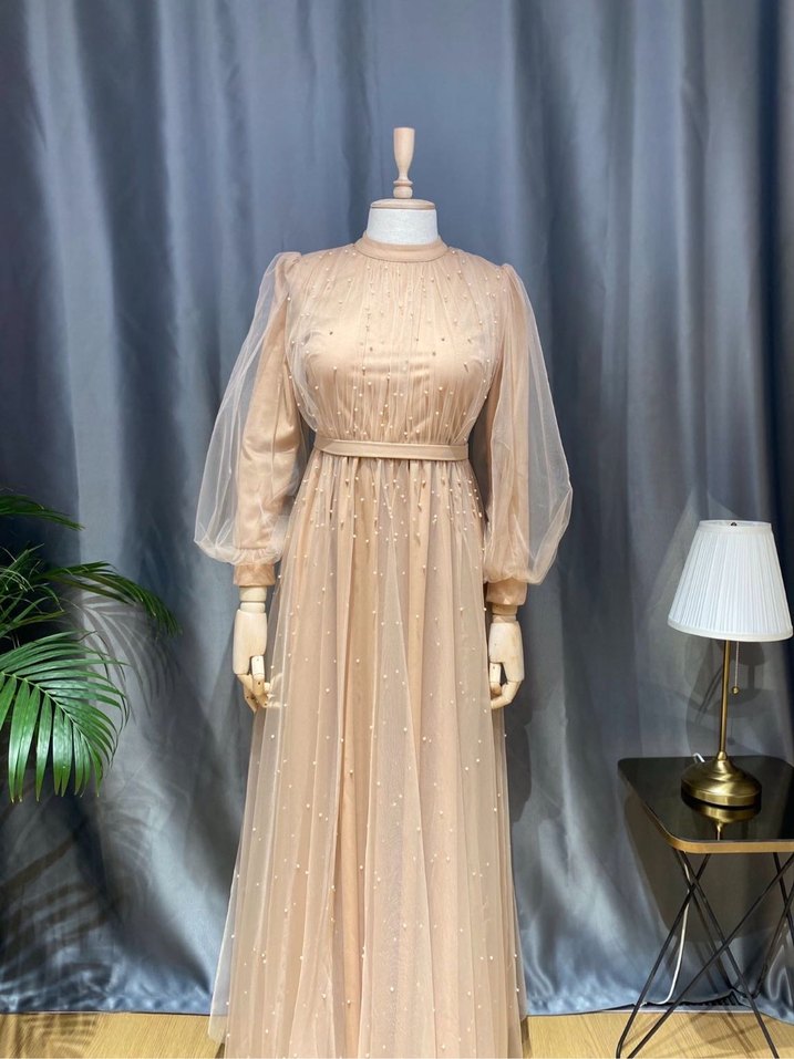 İşlemeli Bej Uzun Kollu Abiye Elbise