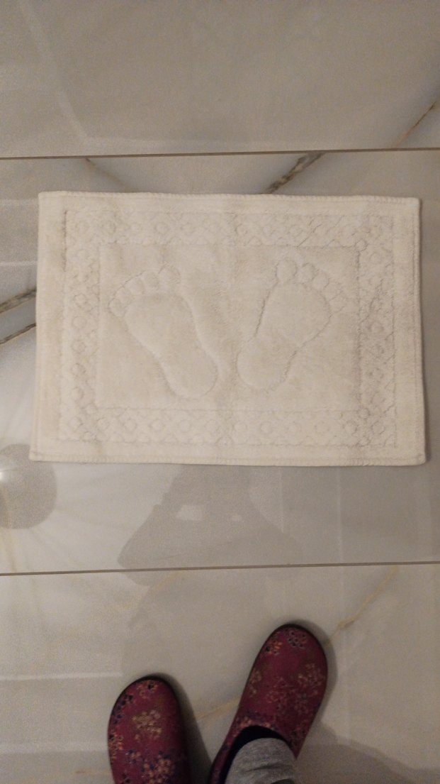 İşlemeli ayak izi desenli beyaz banyo paspası, banyonuza hafif dokulu bir görünüm katar.