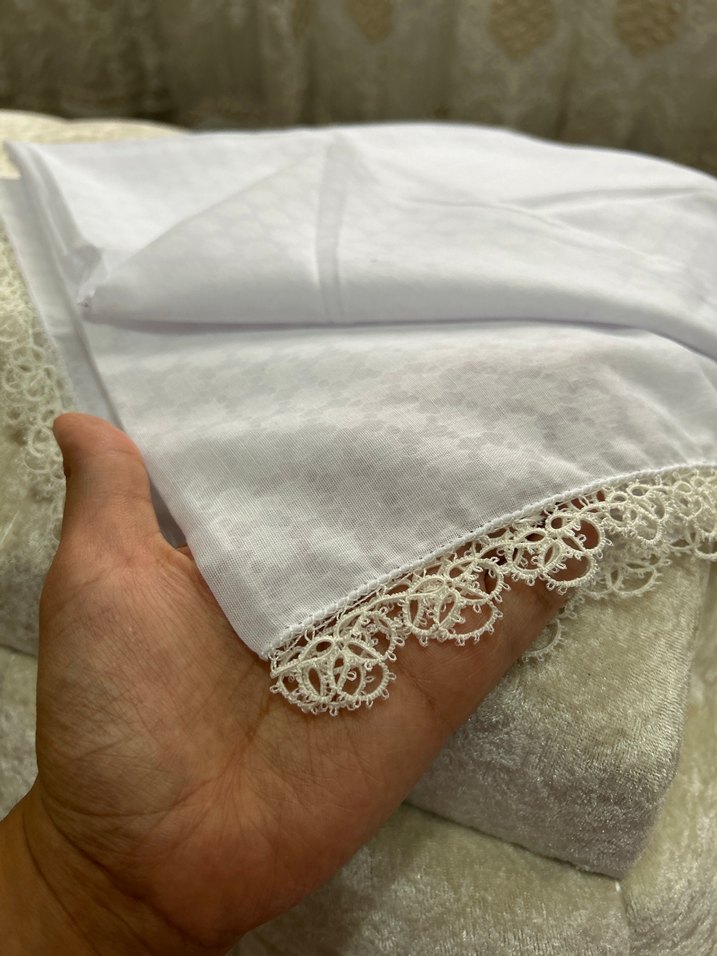 Baş örtüsü, kenarlarında ince işlemelerle sade ve rahat bir tarza sahip. Kumaşı hafif parlaklık sunar.