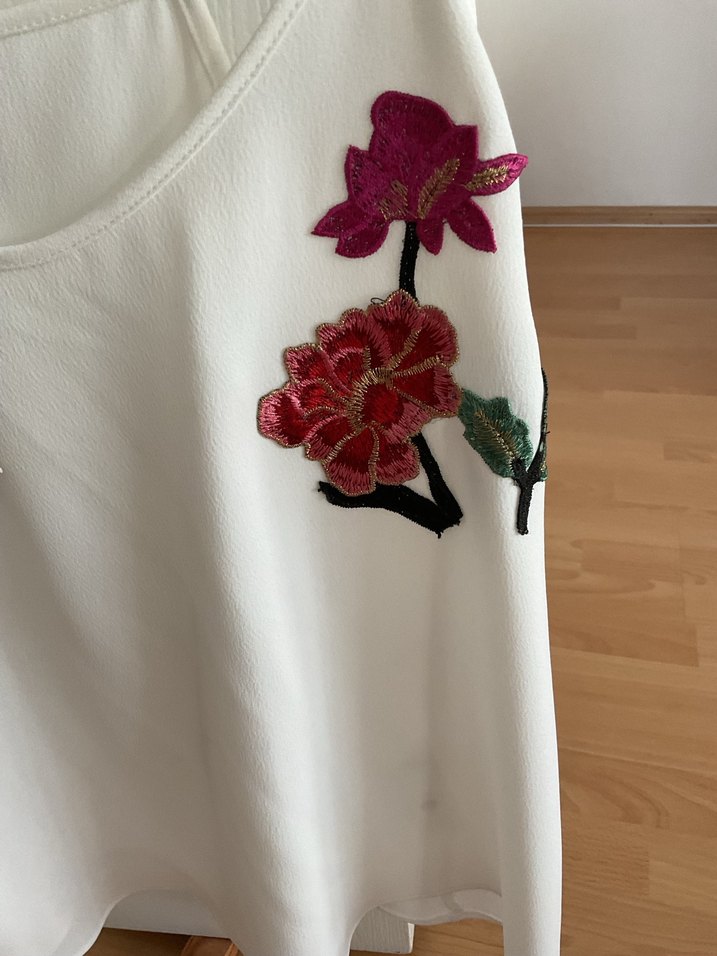 İşlemeli çiçek detaylı, kırık beyaz bluz.Salaş kesim ve normal midi boyda, günlük kullanım için uygun bohem Paris tarzı. 2 beden