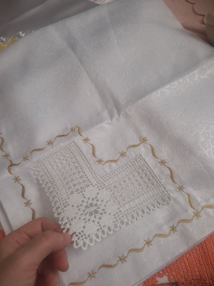 İşlemeli desenlere ve parlak görünüme sahip beyaz bohça 2 adet fiyatı 1 adet olarak sunulmuştur geleneksel tığ işi detayları içerir. ✨