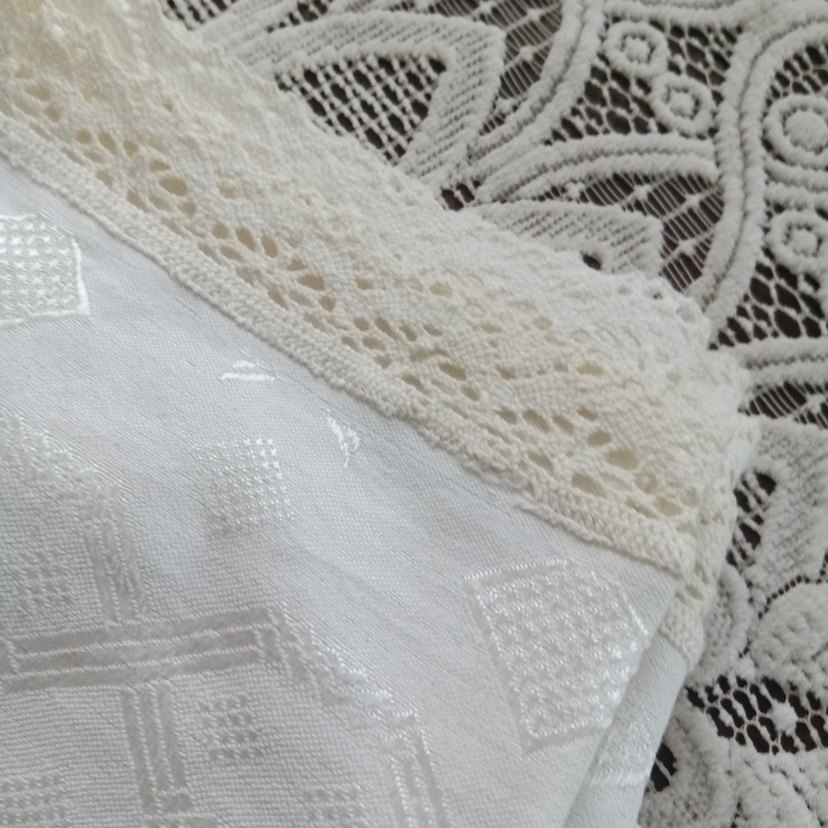 Hafif beyaz renkte, işlemeli ve bohem tarzda masa örtüsü, masanıza zarif bir dokunuş katıyor. 200*233 ölçülerinde kenarları dantelli, üzeri floş desenli iki kişilik pike.