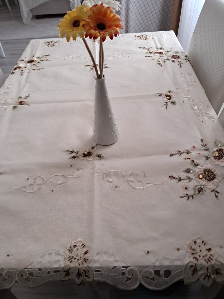 İşlemeli çiçek desenleriyle krem bohem tarzda masa örtüsü takımı.Masanıza zarif bir dokunuş katar. Elde işlenmiştir boncuk detaylı.10.parçadır 1.ad masaörtüsü.1.ad ranır.6.ad peçete.2.ad orta sehpa örtüsü.